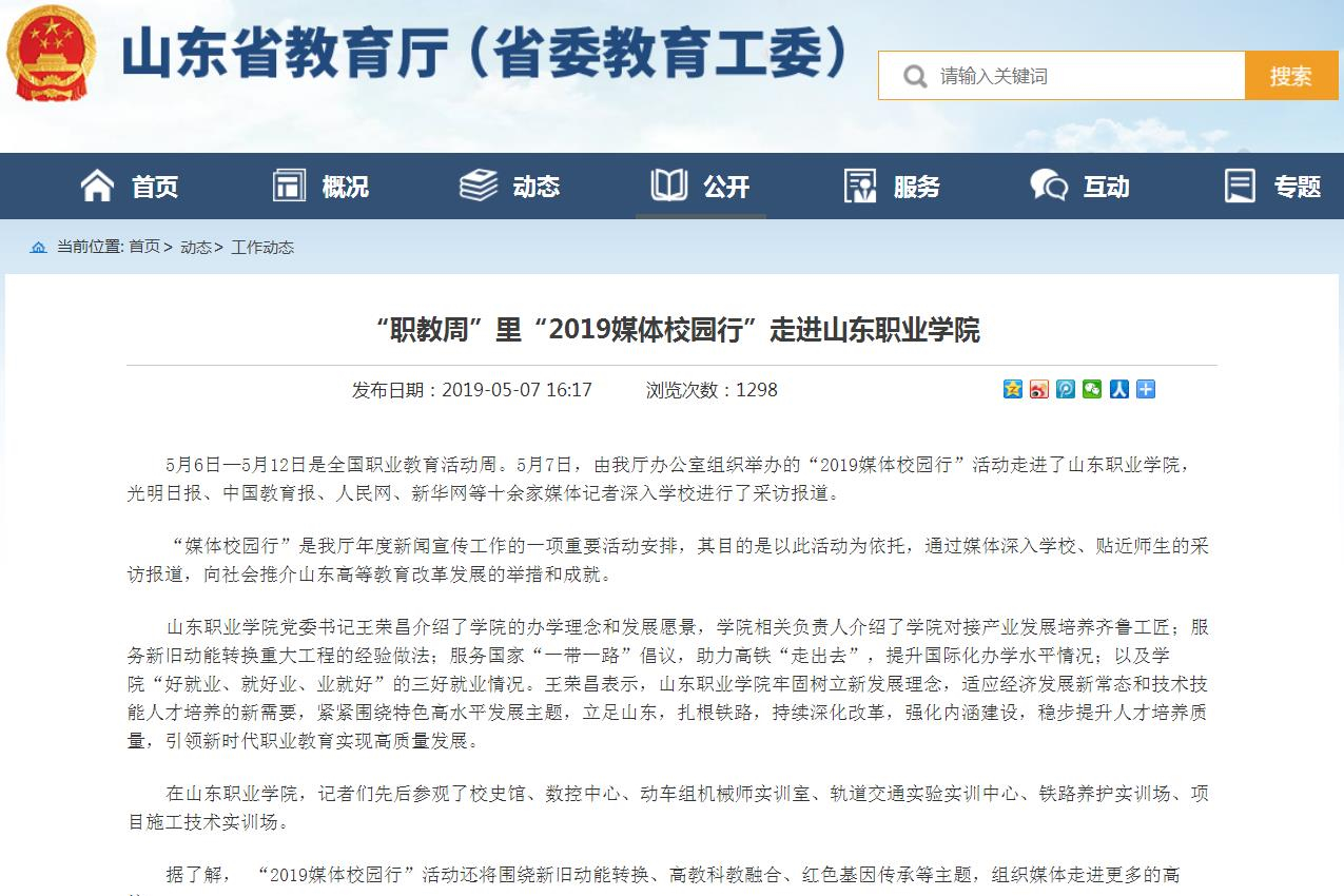 利用媒體進校園活動,大力宣傳學院加快優質校建設,在培養齊魯工匠后備人才、服務全省新舊動能轉換重大工程、服務國家軌道交通事業發展和“一帶一路”建設等方面取得的成績。光明日報、中國教育報、山東教育電視臺、山東教育報、齊魯晚報、經濟導報、人民網、新華網、中國網、齊魯網、鳳凰網、大眾網、新浪網等10多家國家級、省級媒體發布學院采訪報道20余篇。