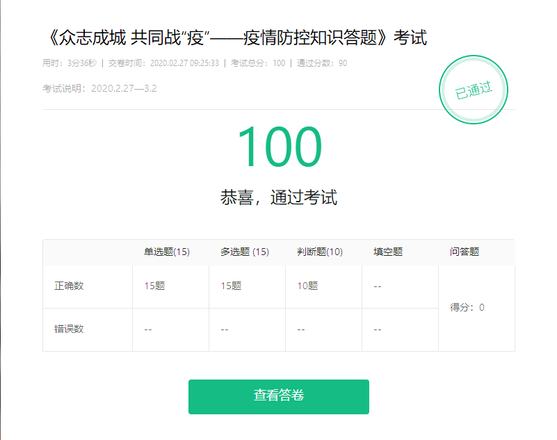 本次疫情防控知識答題涵蓋疫情科普知識、防控措施、膳食營養、科學健身、心理健康等多項內容,融知識性、教育性與實用性為一體,題型分為題型為單選題、多選題和判斷題。為讓大家真正掌握疫情防控知識,此次答題滿分100分,由系統統一評分,設定90分通過,未通過者可在規定時間內重復答題,直至通過為止。全院教職工積極參與答題活動,參與率接近100%,營造了濃厚的防疫知識學習氛圍,增強了大家的自我防控意識,取得了良好效果。