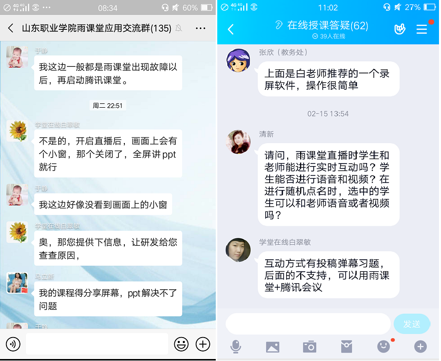 此外,學院還建立了校、系兩級QQ和微信答疑群,教務處、系部及平臺專家和任課教師在線上“齊聚”,圍繞在線授課中的各類問題交流和討論,為新學期線上教學工作正常開展答疑解惑。各系部積極引導學生主動配合,發放在線學習指導,及時通知疫情期間線上教學課程表、學習要求等相關事宜,做好學生群體思想引導和學習組織工作。