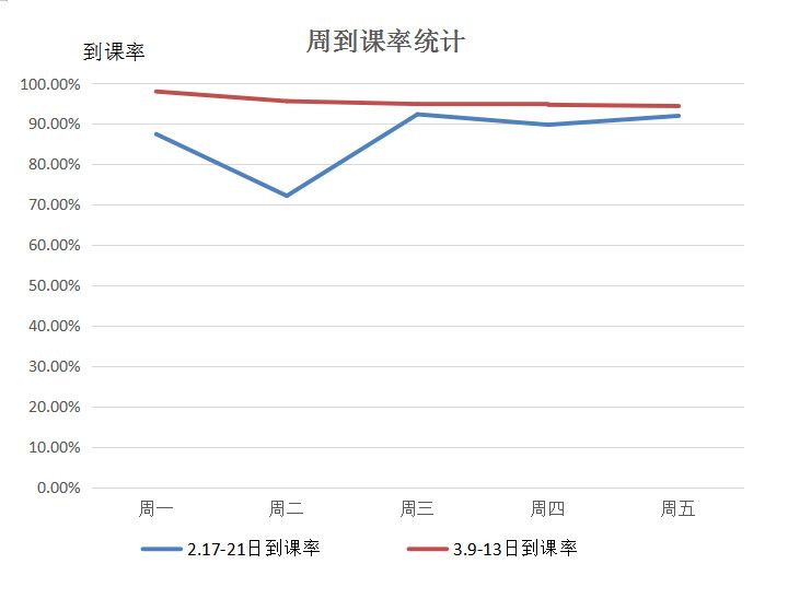 2月17日至21日線上教學第一周,學生平均到課率為86.74%。3月9日至13日線上教學第四周,學生平均到課率達到95.52%。學生到課率穩步提升。