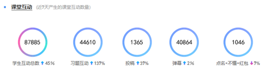 以線上教學第四周為例,教師與學生互動總數為87885個,其中習題互動和發送彈幕數量最多,分別為44610個和40864個。