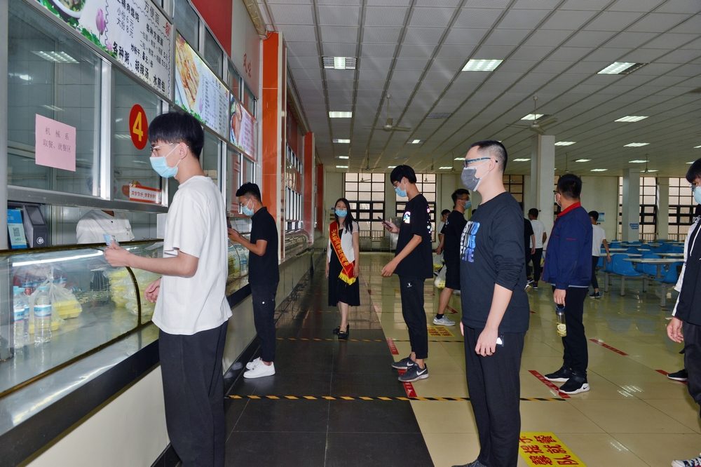 學院黨委高度重視返校學生在校期間的安全健康,針對中午就餐高峰期秩序安全,機關黨總支主動擔當、主動上前,每日安排一定數量黨員到餐廳服務,引導師生有序進出餐廳,嚴格體溫檢測,嚴格手部清潔,保持安全距離排隊取餐,堂食在指定區域、單人單座、同一方向用餐。