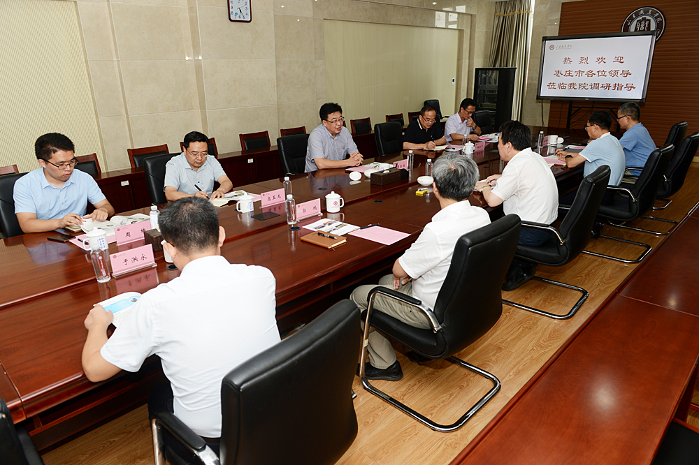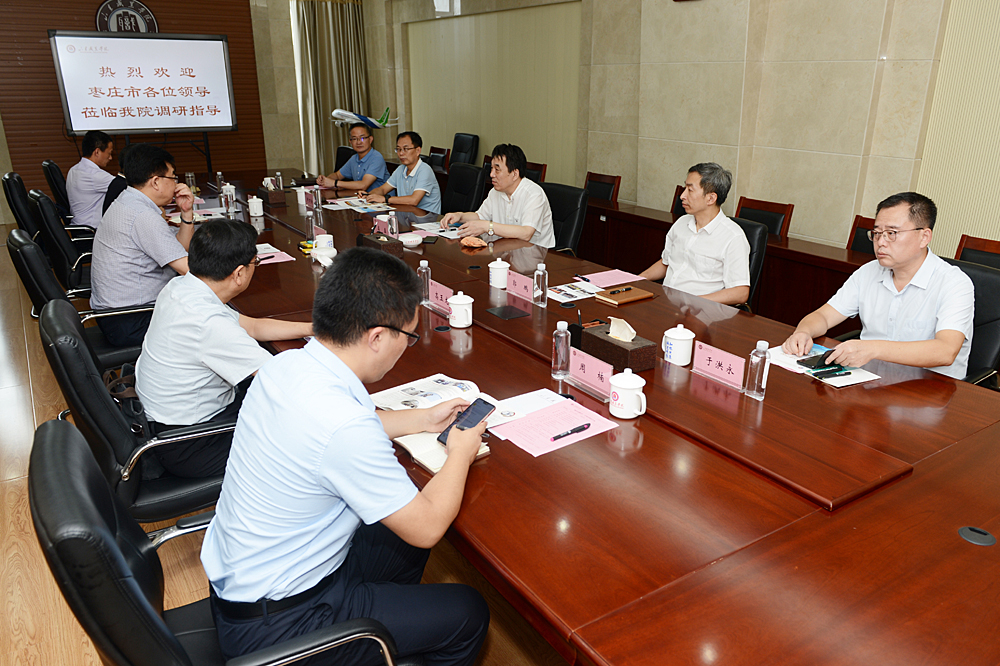 7月29日下午,棗莊市人民政府副市長周宗安率隊,棗莊市教育局局長郝榮平等一行5人來我校考察產教融合、校企合作。學校黨委書記高磊、副院長郭鵬出席會見。