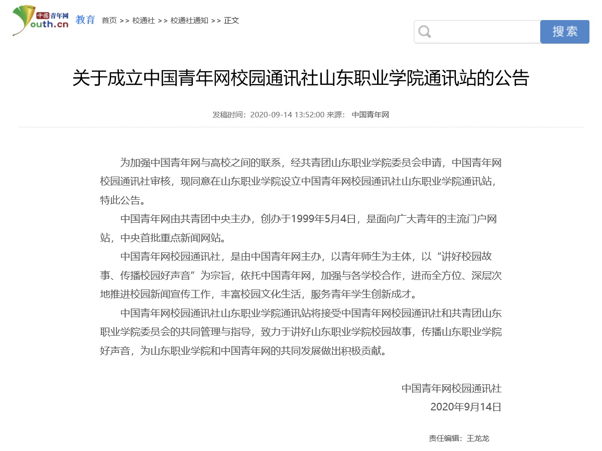 9月14日,中國青年網正式發布公告,批準在我校建立“中國青年網校園通訊社山東職業學院通訊站”。今后,本通訊站將通過中國青年網、三下鄉官網、中青校園等平臺進行校園新聞宣傳工作。
