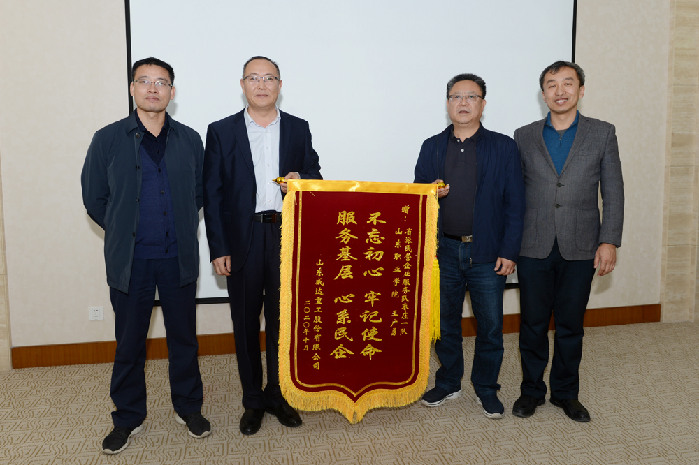 10月29日上午,山東威達重工股份有限公司副總經理、財務總監韓杰和公司綜合辦公室主任徐偉偉專程來到山東職業學院,向學校贈送了錦旗,感謝學校派出干部對企業的幫助和支持。副院長郭鵬接待了來訪客人。