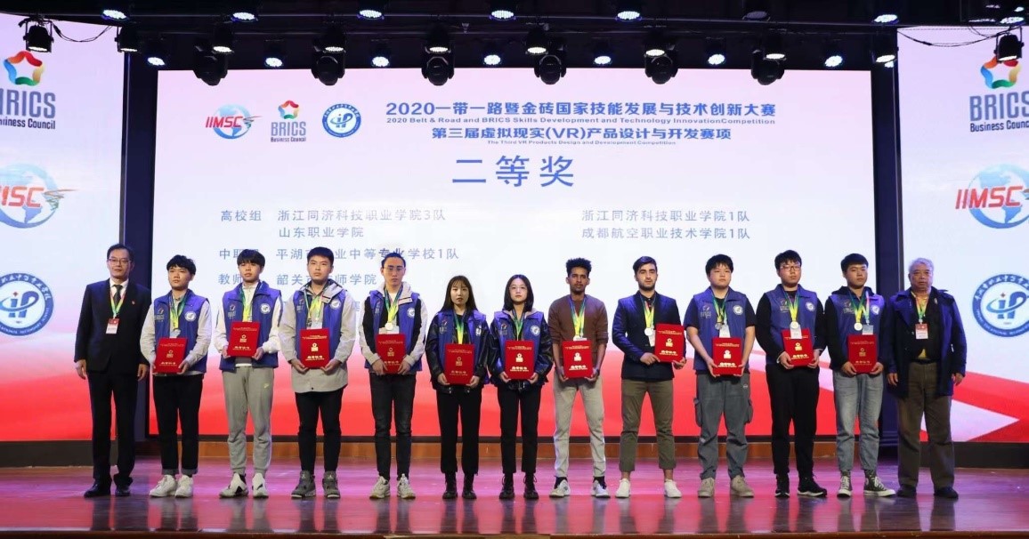 10月27日-30日,2020“一帶一路”暨金磚國家技能發展與技術創新大賽---第三屆虛擬現實(VR)產品設計與開發大賽在浙江省平湖市舉行。經過職業能力測評、VR技能實際操作、技術答辯等三個環節的激烈角逐,我校參賽隊各賽項考核成績綜合排名第四,獲得二等獎。