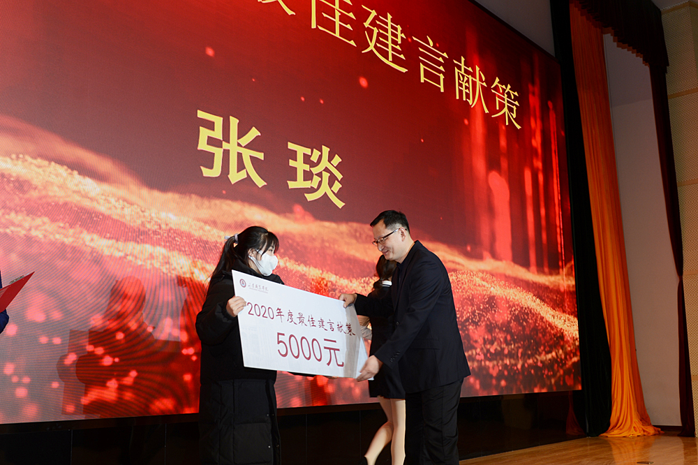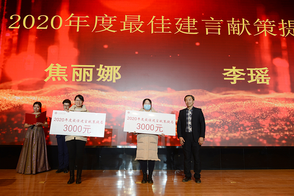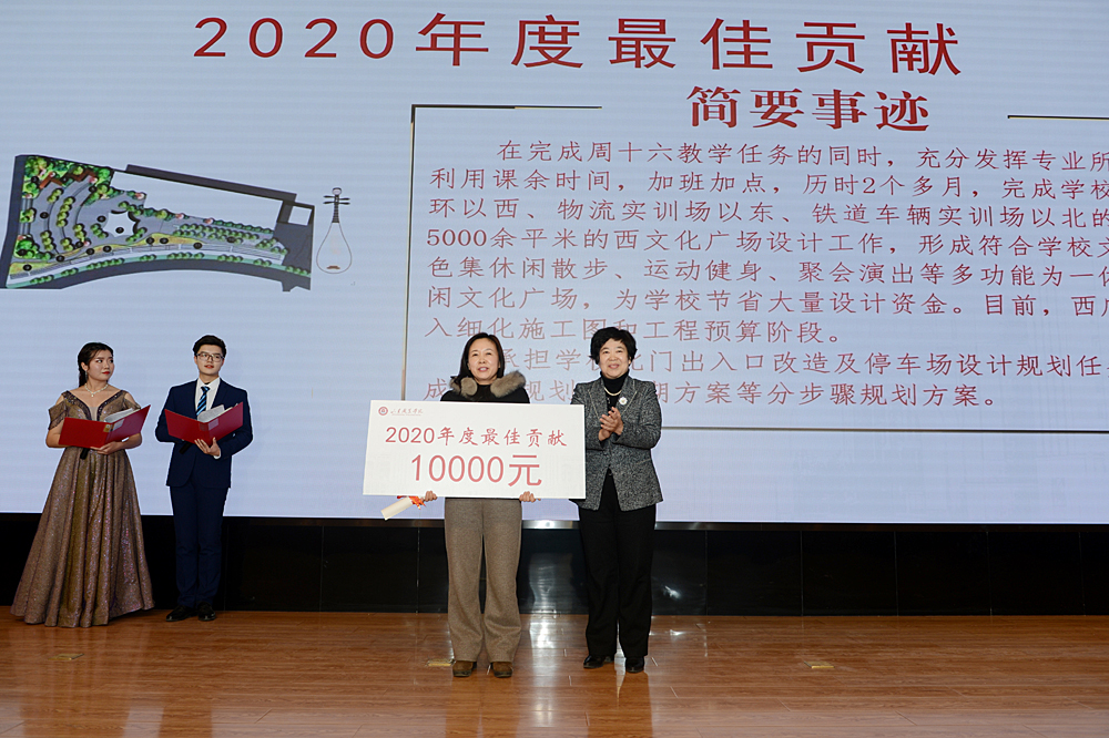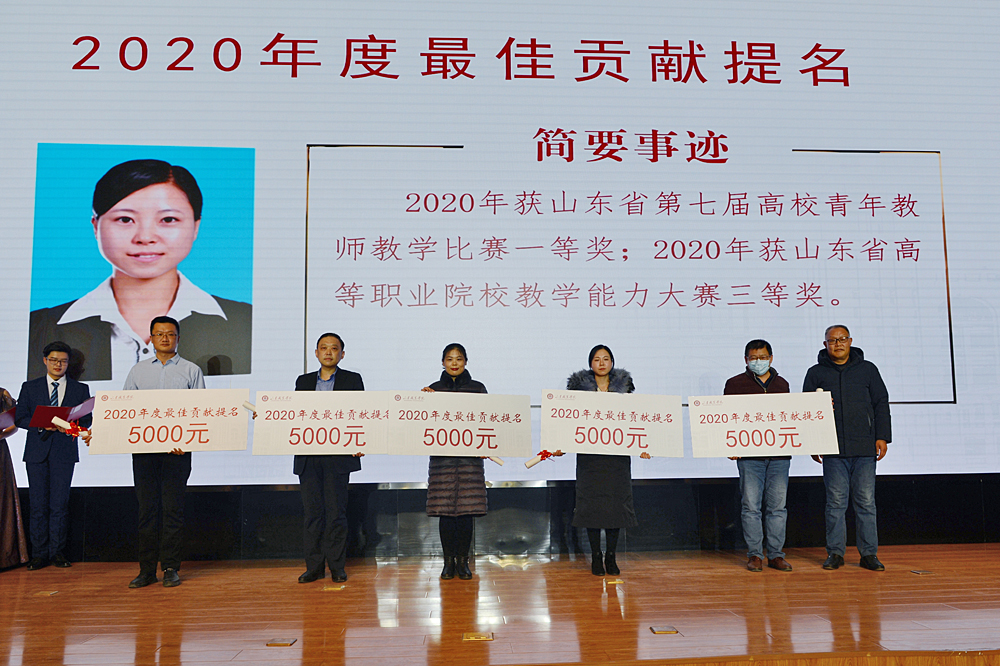 紀委書記祝介安向總務處鄭恒、學生工作處王寧、易安書院張錦、鐵道學院梁雪、鐵道學院王志亮頒發了2020年度最佳貢獻提名。