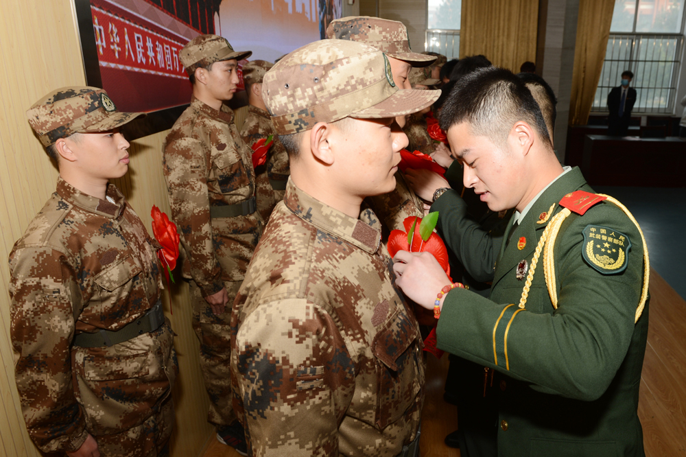 在“沒有共產黨就沒有新中國”的樂曲中,與會領導為入伍學生頒發了紀念品,退伍學生為新入伍學生佩戴了光榮花。