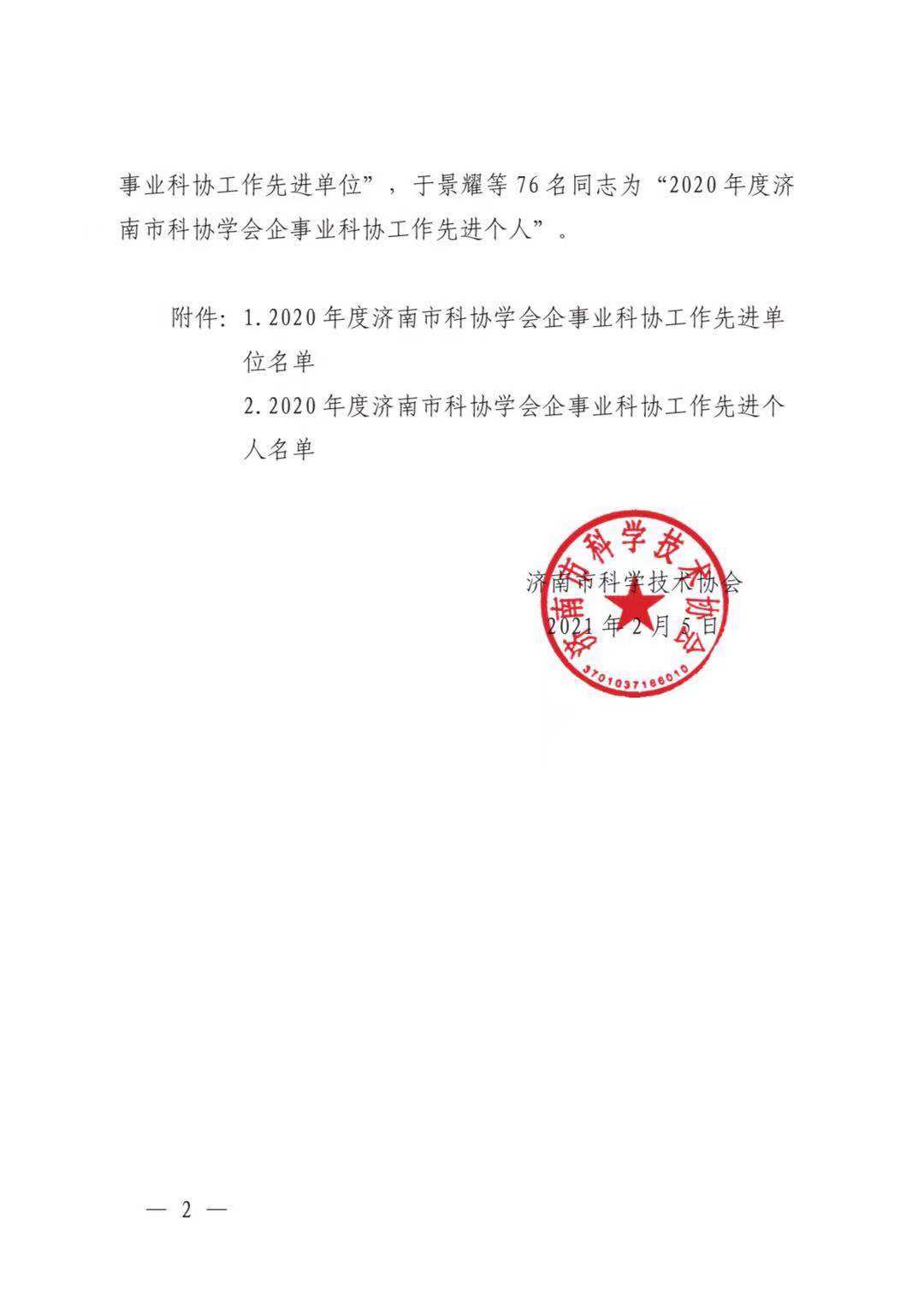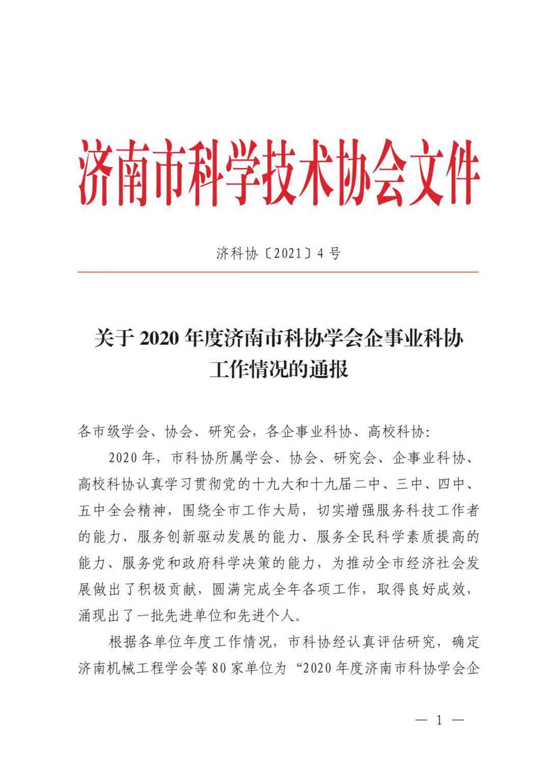 我校科協榮獲“2020年度濟南市科協學會企事業科協工作先進單位”榮譽稱號
