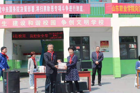 莊科小學賈玉美校長代表學校對郭鵬一行的到來表示由衷的歡迎,對我校為莊科小學捐贈電腦、圖書表示真摯的感謝。她指出,莊科小學作為山東職業學院圖書館黨支部的黨建活動基地,長期以來,雙方保持著密切聯系,開展了系列卓有成效的黨建活動。我們一定會利用好本次的捐贈物品,助力學校教育教學。