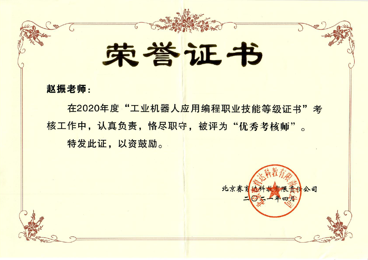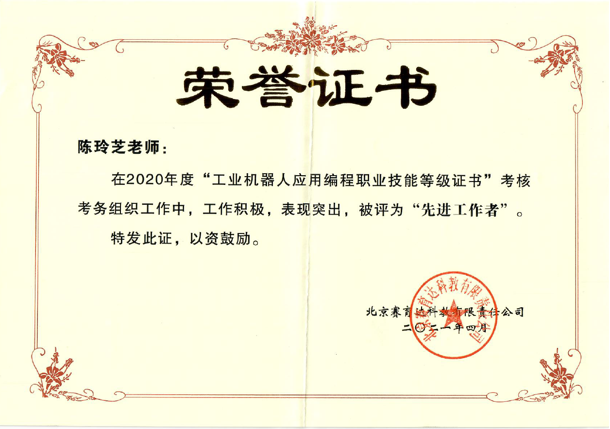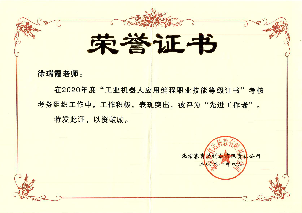 2020年,我校實施工業機器人應用編程1+X證書試點,與北京賽育達科教有限公司在推進書證融通、與學分銀行對接、賽證融通等方面開展深度合作,為智能制造領域復合型技術技能人才培養搭建了良好的平臺。我校也因在考務管理、師資培訓、課證融通研究與實施等方面的突出工作,被授予優秀試點院校,徐瑞霞、陳玲芝和趙振三位老師分別被授予優秀考務工作者和優秀考核師。