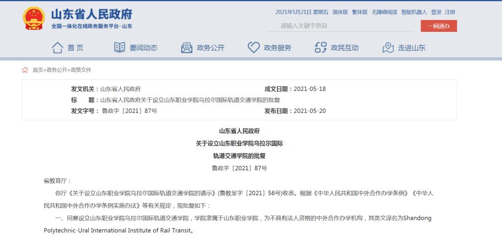 5月20日,山東職業學院與俄羅斯烏拉爾國立交通大學聯合舉辦的非獨立法人中外合作辦學機構“山東職業學院-烏拉爾國際軌道交通學院”,獲山東省人民政府正式批復。