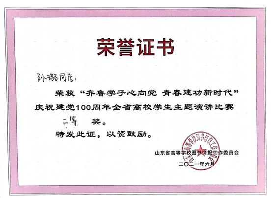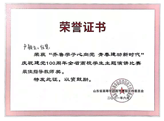 6月11日,由山東省高等學校圖書情報工作委員會主辦的“齊魯學子心向黨 青春建功新時代”慶祝建黨100周年全省高校學生主題演講比賽決賽在山東師范大學長清湖校區舉行。全省共有36所高校參加決賽,我校選手鐵道機車1931班孫璐獲二等獎,圖書館盧穎立、任斐獲最佳指導教師獎。