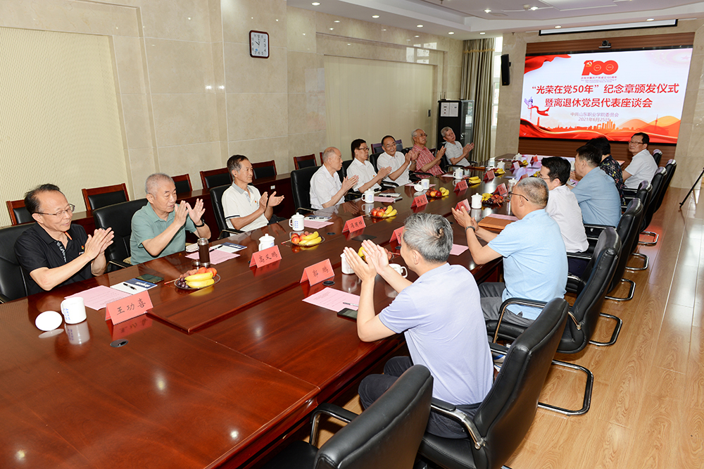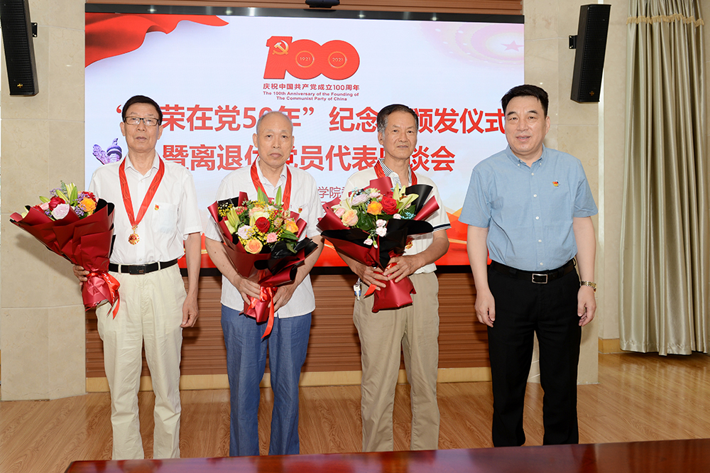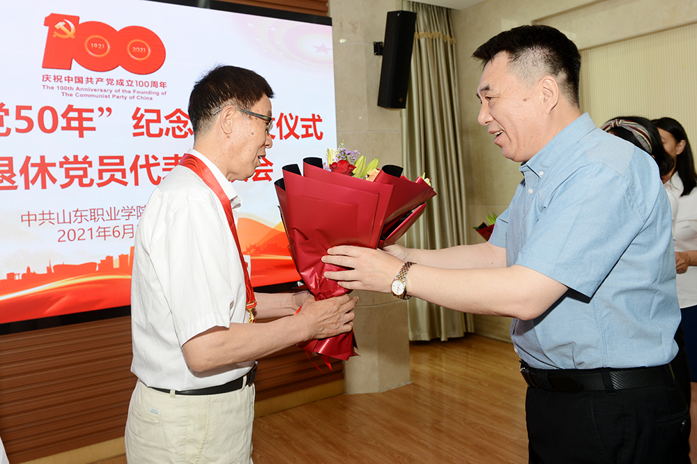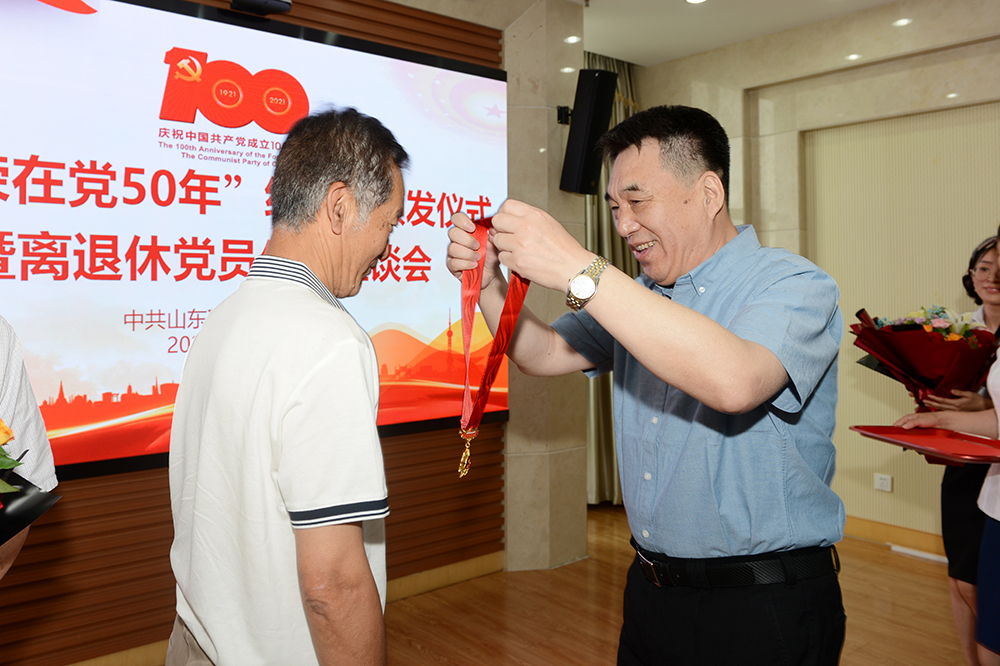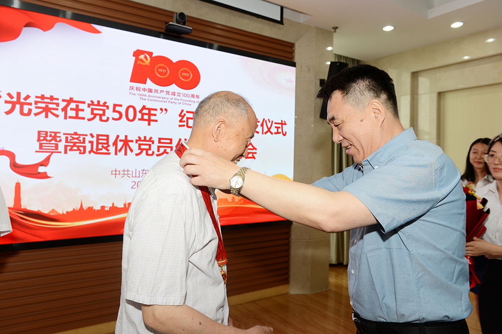 頒發“光榮在黨50年”紀念章工作是中國共產黨成立100周年慶祝活動的重要組成部分。今年是首次頒發,我校共有39位老黨員榮獲紀念章。許金亮、孔凡柱、馮國祥三位老黨員代表參加了本次頒發儀式。黨委書記高磊向老黨員代表頒發紀念章。