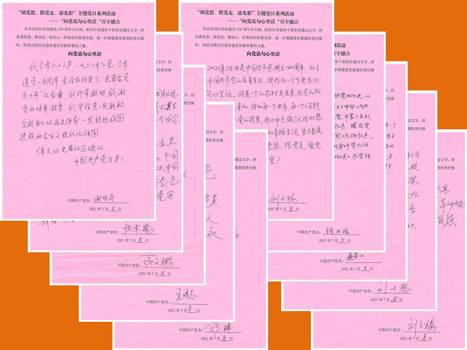 會議最后,各支部開展了“向黨說句心里話”百字感言心里話活動。老同志結合黨史學習教育,一筆一劃寫下對黨想說的心里話,記錄下對中國共產黨成立百年的感言、對黨的祝福。老同志們表示,只有祖國的強大,才能歲月靜好,樂享生活,在新的歷史時期,會一如既往的不忘初心、牢記使命,永遠跟黨走。