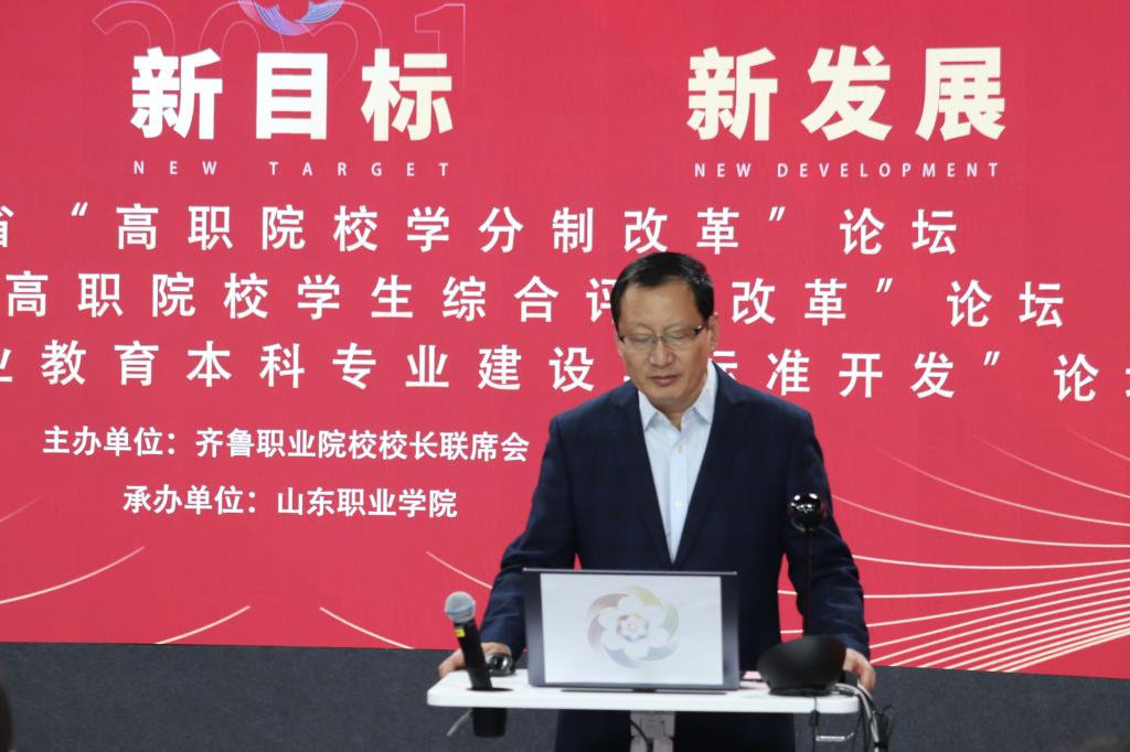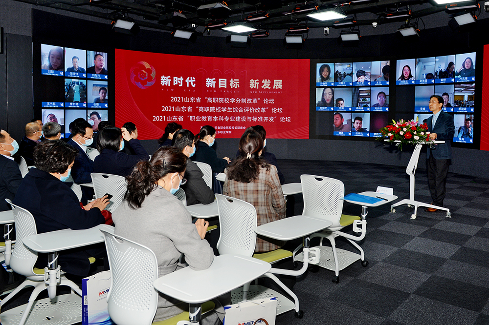 11月18日上午,由齊魯職業院校校長聯席會議主辦、我校承辦的山東省“職業教育本科專業建設與標準開發論壇”“高職院校學分制改革論壇”“高職院校學生綜合評價改革論壇”三個論壇在我校新建成的全景教室開幕。院長秦河致歡迎辭,省教育廳職教處副處長陳志浩出席并講話,全省各高職院校領導、教育教學管理人員、學生管理人員、專業帶頭人、骨干教師等通過線上線下相結合的方式參加論壇。開幕式由副院長王紹軍主持。