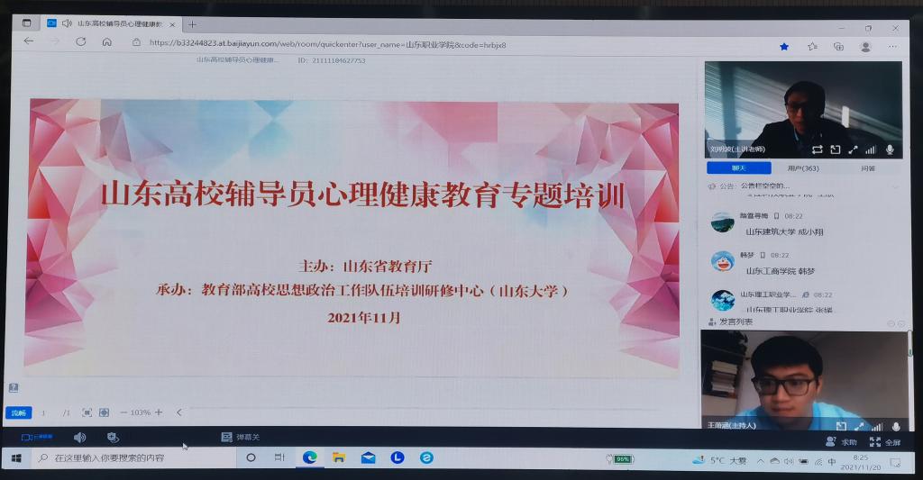 本次培訓以線上直播形式進行,包括輔導員談心談話與溝通技巧、大學生積極心理品質培養、常態化疫情防控背景下大學生心理健康教育與調適、大學生心理危機預防與應對四個專題。培訓內容豐富、操作性強,有效提升了輔導員的心理育人工作水平。