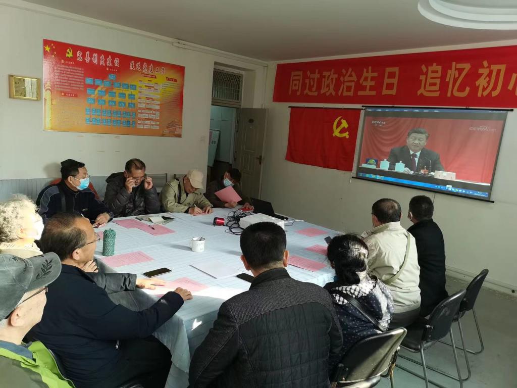 退休老同志們一起觀看《中國共產黨第十九屆中央委員會第六次全體會議公報》、《政治生日》解讀、《陳巖石講黨課》等專題視頻,黨支部書記給每位參加會議的老黨員發放政治生日賀卡并持卡合影留念。每位黨員還書寫了“向黨說句心里話”百字感言,并現場交納了黨費。