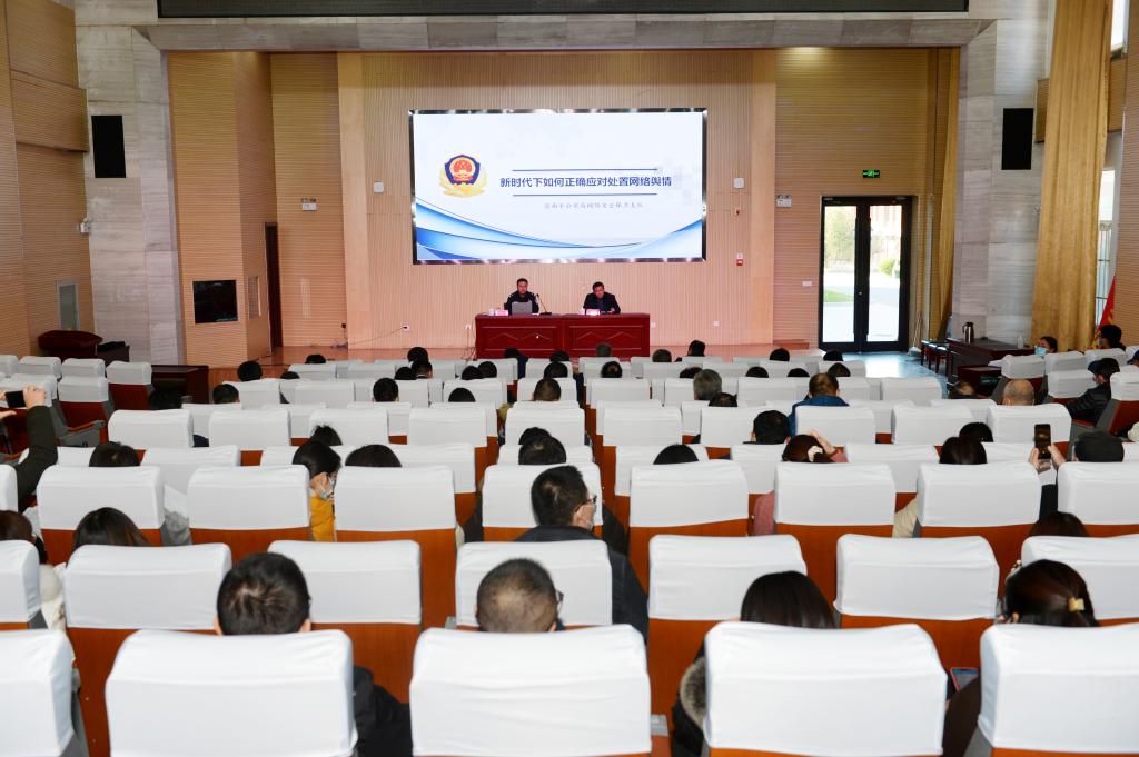 為提高我校教職工網絡輿情應對和處置能力,規范網絡行為,有效防范和化解網絡輿情風險,12月1日,我校在東報告廳舉辦了網絡輿情應對處置培訓會。濟南市公安局網絡警察支隊韓丕群應邀作了題為《新時代下如何正確應對處置網絡輿情》的輔導報告。培訓會由黨委宣傳部部長杜樹元主持。