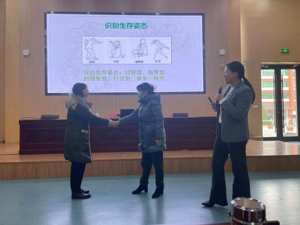 蘇睿是國家職業心理咨詢師,山東省行為學會理事、山東省大學生心理健康教育與咨詢委員會理事、全國高校心理委員研究協作組理事、中科院心理研究所心理援助聯盟危機干預成員。她主要圍繞“看見自己、回歸自己、成為自己”三部分內容進行講解。在“看見自己”部分,帶領大家了解了關于情緒、防御模式、行為模式的相關知識,并以互動的形式教會大家識別生存姿態,增強心理彈性。在“回歸自己”和“成為自己”部分,通過列舉實例、傳授具體方法,讓大家學會“和解、轉化、回歸愛”。最后,蘇主任帶領大家共讀《當我內心足夠強大》為全場賦能。講座內容豐富、精彩紛呈、溫暖感動。
