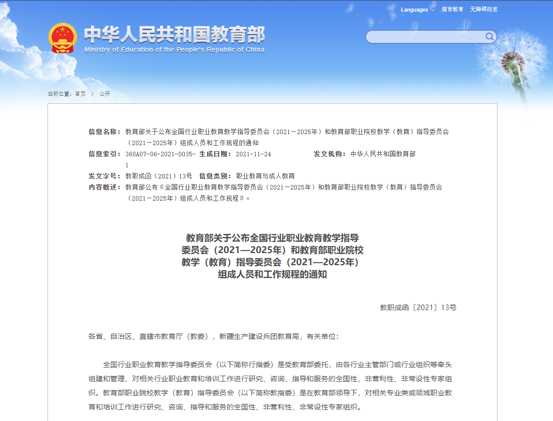 全國行業職業教育教學指導委員會(以下簡稱行指委)是受教育部委托,由各行業主管部門或行業組織等牽頭組建和管理,對相關行業職業教育和培訓工作進行研究、咨詢、指導和服務的全國性、非營利性、非常設性專家組織。教育部職業院校教學(教育)指導委員會(以下簡稱教指委)是在教育部領導下,對相關專業類或領域職業教育和培訓工作進行研究、咨詢、指導和服務的全國性、非營利性、非常設性專家組織。兩個委員會在職業教育深化產教融合、校企合作,聚合行業企業資源,推進教育教學改革,加強職業教育科研和隊伍建設,提高人才培養質量等方面發揮著重要作用。