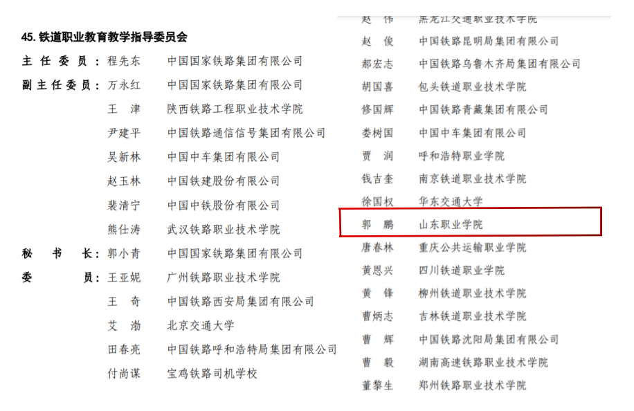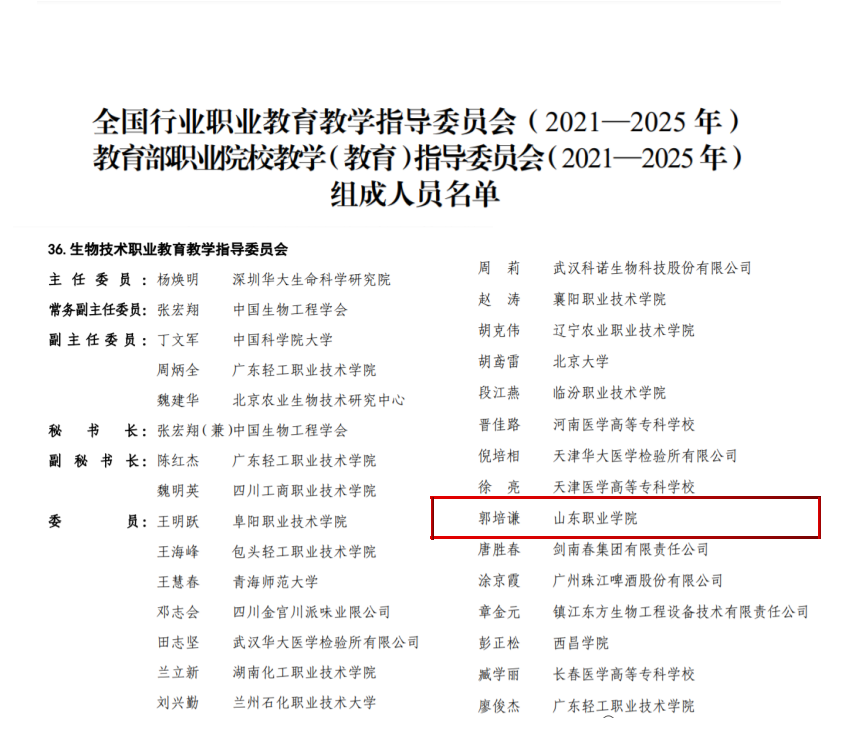 近日,教育部公布了全國行業職業教育教學指導委員會(2021—2025年)和教育部職業院校教學(教育)指導委員會(2021—2025年)組成人員,我校黨委副書記郭培謙入選生物技術職業教育教學指導委員會委員,副院長郭鵬入選鐵道職業教育教學指導委員會委員。