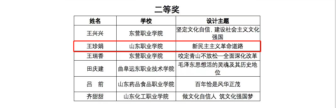 近日,山東省教育廳公布了首屆全省學校思政課教學設計大賽獲獎名單,我校范瑞仙老師榮獲高職高專“思想道德與法治”組二等獎,王珍娟老師榮獲高職高專“毛澤東思想和中國特色社會主義理論體系概論”組二等獎。
