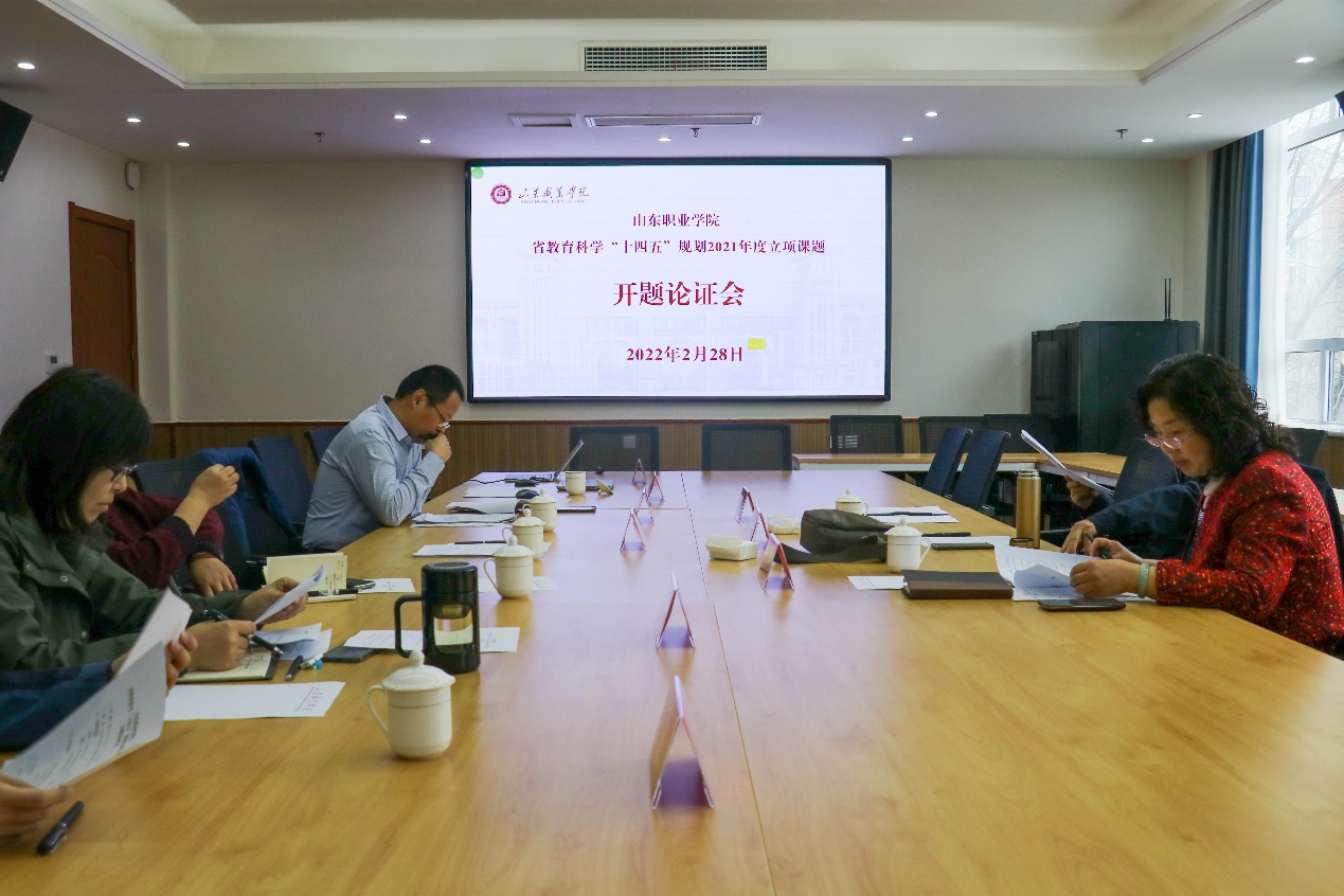 2月28日上午,我校在南樓二樓會議室舉行省教育科學“十四五”規劃2021年度課題開題論證會,邀請到山東農業大學王漢忠教授、山東商業職業技術學院徐紅教授、山東旅游職業學院楊秀冬教授擔任評議專家。副院長祝瑞花出席論證會,課題組成員及學校科研管理人員參加會議。