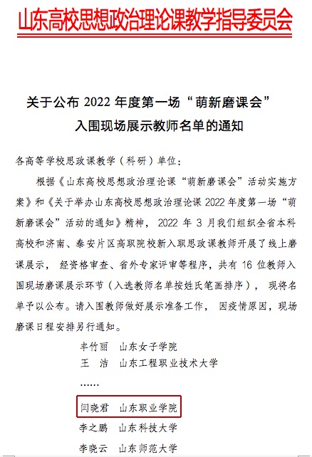 近日,山東高校思想政治理論課教學指導委員會公布了山東高校思想政治理論課2022年度第一場“萌新磨課會”入圍現場展示環節教師名單,我校教師閆曉君成功入圍。