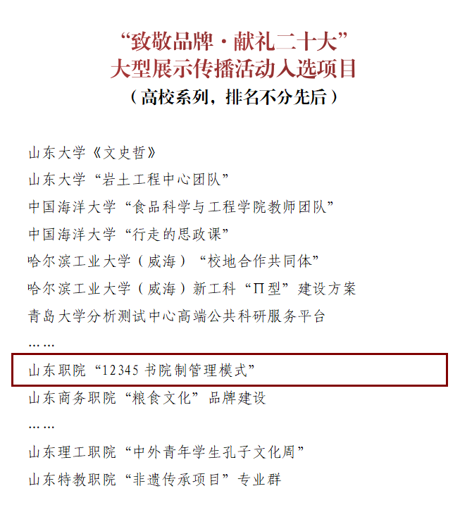 省教育廳組織開展“致敬品牌·獻禮二十大”大型展示傳播活動,是為了全面總結梳理黨的十八大以來山東教育改革發展成就,充分展示各高校特色品牌,形成山東教育“品牌”系列,獻禮黨的二十大。在各高校項目申報基礎上,經過廣泛征求意見和專家評選論證,確定了包括山東大學《文史哲》、我校“12345書院制管理模式”在內的79個項目入選山東教育展示傳播“品牌系列”(高校類)。