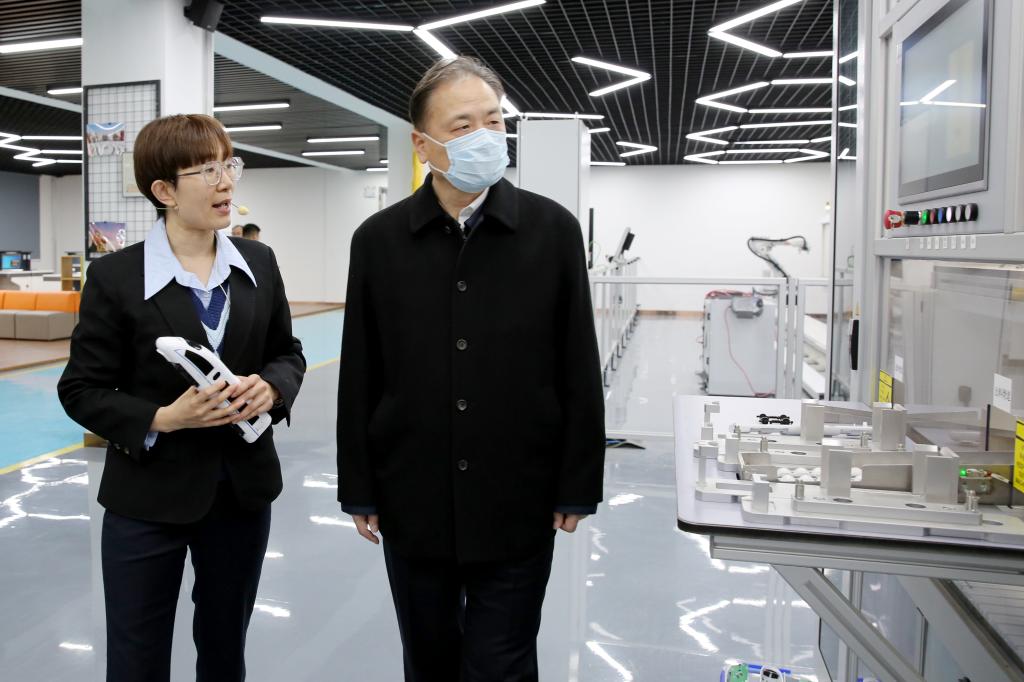 王東一行實地考察了我校春季高考技能測試設備維修類別考點、軌道交通實驗實訓中心、梧桐花開實驗室、智能制造虛實融合公共實訓基地等,并在五號教學樓一樓會議室進行座談交流。