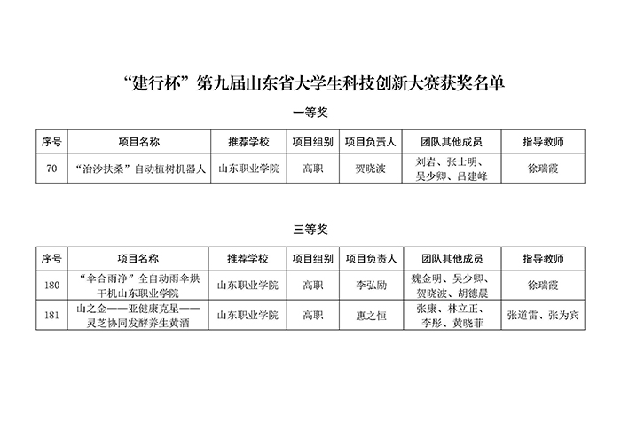 近日,山東省教育廳公布了“建行杯”第九屆山東省大學生科技創新大賽獲獎名單,我校榮獲一等獎1項,三等獎2項。