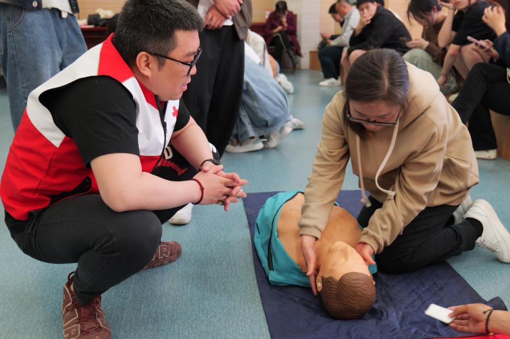 培訓中,兩位講師詳細講解了手臂包扎法、頭頂帽式包扎法等六種創傷救護包扎技術和心肺復蘇的詳細步驟以及自動體外除顫儀(AED)的使用方法。師生兩人一組進行了實踐練習,兩位講師現場指導,及時糾正實操中存在的問題。