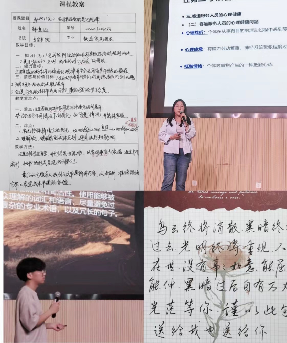 展現專業風采,揚起成功風帆。同學們根據自己喜歡的一節專業課,設計教案,模擬授課,他們略顯稚嫩但飽含深情、邏輯清晰的講述,既鍛煉了語言表達能力,又提升了專業認知水平;同學們親手摘抄的夢中“情話”,無論是積極向上的語言文字還是情感表達,充分展現新時代大學生積極向上的時代風貌。
