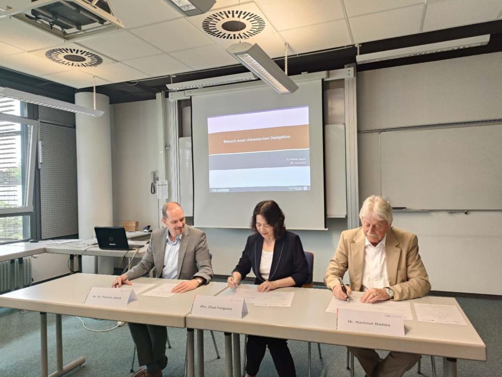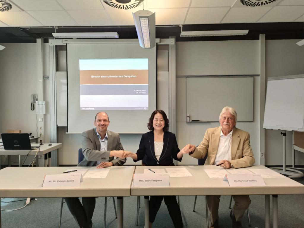 6月28日上午,我校與德中職業教育友好合作促進協會、德國卡爾斯魯厄手工業協會教育學院共同簽署了《職業教育合作意向書》。簽約儀式在德國卡爾斯魯厄手工業協會教育學院舉行,黨委書記趙鳳文、德中職業教育友好合作促進協會主席Hartmut Mattes、卡爾斯魯厄手工業協會主席Patrick Jakob博士分別代表三方簽約。