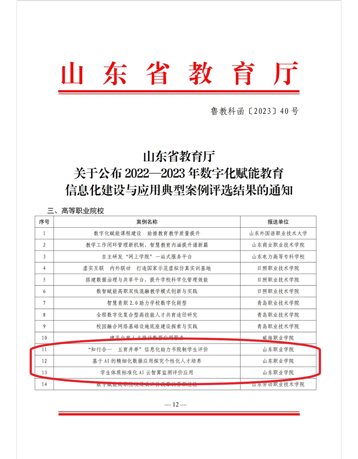 近日,山東省教育廳公布了2022-2023年數字化賦能教育信息化建設與應用典型案例評選結果,我校報送的《“知行合一 五育并舉”信息化助力書院制學生評價》《基于AI的精細化數據應用探究個性化人才培養》《學生體質標準化AI云智算監測評價應用》三項案例全部入選。