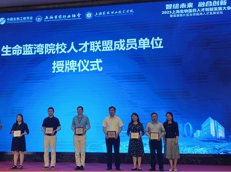 大會聚焦服務上海生物醫藥及臨港新片區生物醫藥人才發展,不斷開拓人才服務新模式,打造人才服務新品牌,推動構建臨港新片區生物醫藥人才聯合體、創新融合體、發展共同體。生物技術行指委秘書長張宏翔作了題為《生物經濟時代與科技社團職責》的報告,并介紹了2023《中國生物經濟發展報告》概況。作為生命藍灣院校人才聯盟成員單位,我校參加授牌儀式。