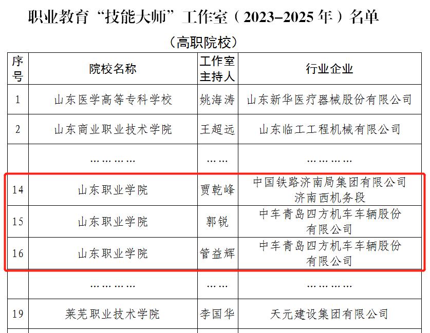 近日,山東省教育廳發布《關于職業教育“技能大師”工作室(2023-2025年)名單公示》,我校聯合中國鐵路濟南局集團有限公司濟南西機務段技能大師賈乾峰、聯合中車青島四方機車車輛股份有限公司技能大師郭銳和管益輝申報的3個工作室均獲批立項山東省職業教育“技能大師”工作室。