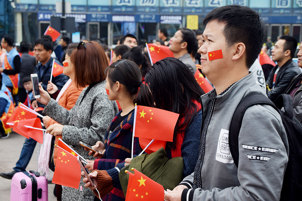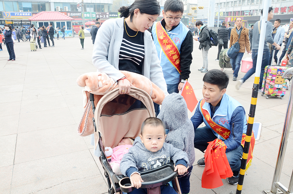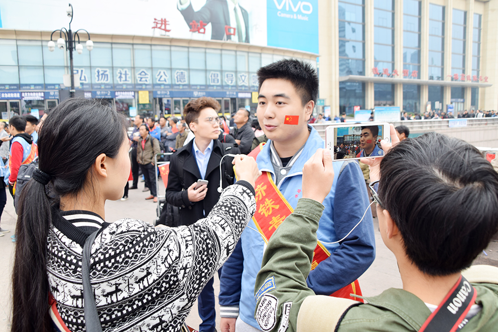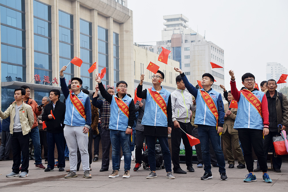 青年志愿者們積極維護廣場秩序,讓旅客們有序觀看十九大開幕盛況,并為旅客發放手持國旗和國旗貼,營造喜慶氛圍。志愿者與游客們揮舞著國旗,唱著國歌,談祖國發展,談身邊變化,談幸福生活,談未來憧憬,臉上洋溢著自豪與驕傲。志愿者與旅客還將“國旗貼”貼在自己的胸口上,齊聲說道“一心向黨,不忘初心跟黨走”,并伸出大拇指為祖國加油點贊。