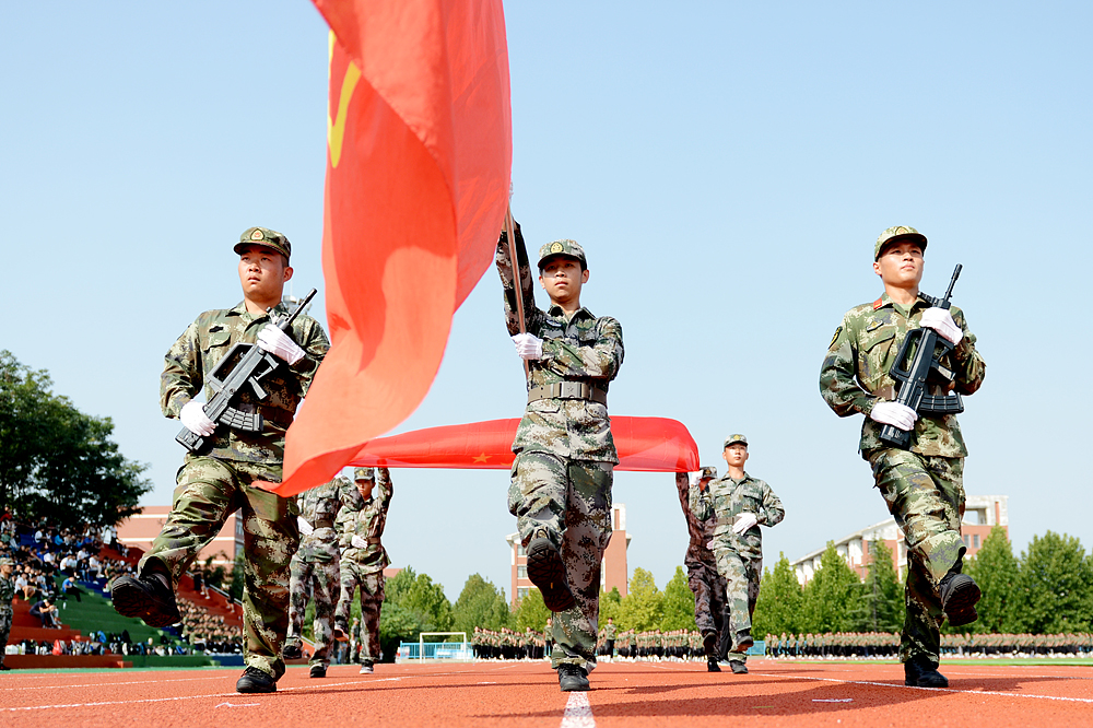 9時30分,新生軍訓成果展示正式開始。鮮艷的五星紅旗在嘹亮的國歌聲中冉冉升起,鏗鏘有力的軍樂旋律讓每一位新生澎湃不已。