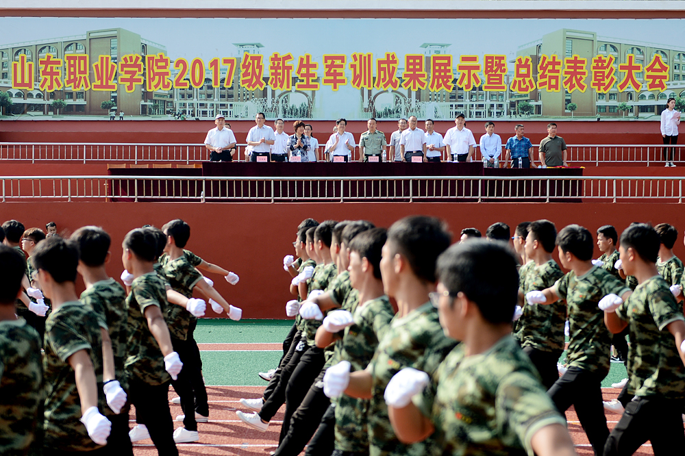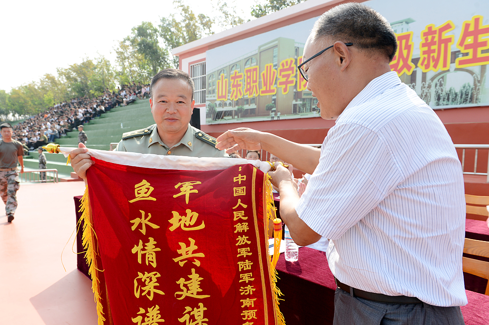 總結表彰大會上,祝介安向承訓部隊贈送了錦旗,郭培謙宣讀了《山東職業學院關于表彰2017年軍訓先進集體的決定》。