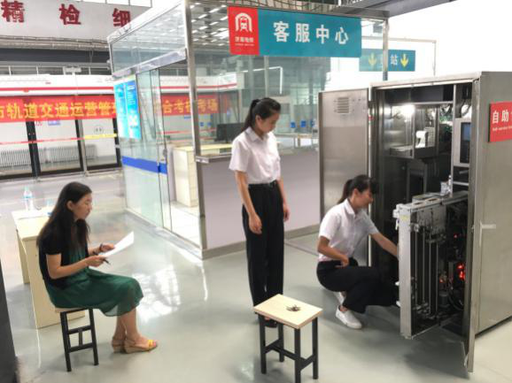 綜合考核包括理論考核和實操考核兩部分。理論考核涵蓋三門專業課的綜合知識考核,實操考核包括車站票務場景模擬、票務終端設備操作、站臺服務、屏蔽門現場處置、手信號操作。