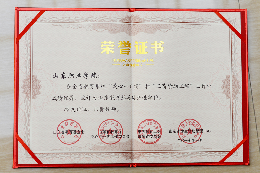 日前,山東省教育基金會對在“愛心一日捐”及“三育資助工程”項目工作中取得顯著成效、績效突出的全省103個單位進行了表彰,我院被評為山東教育慈善獎先進單位。