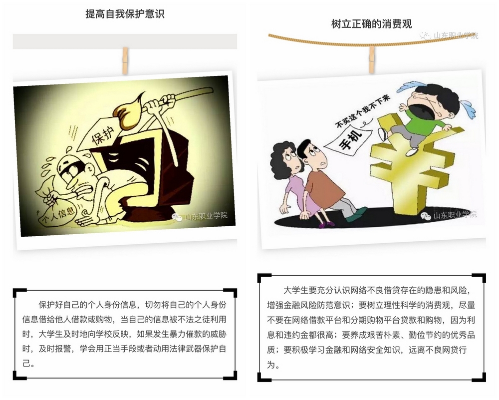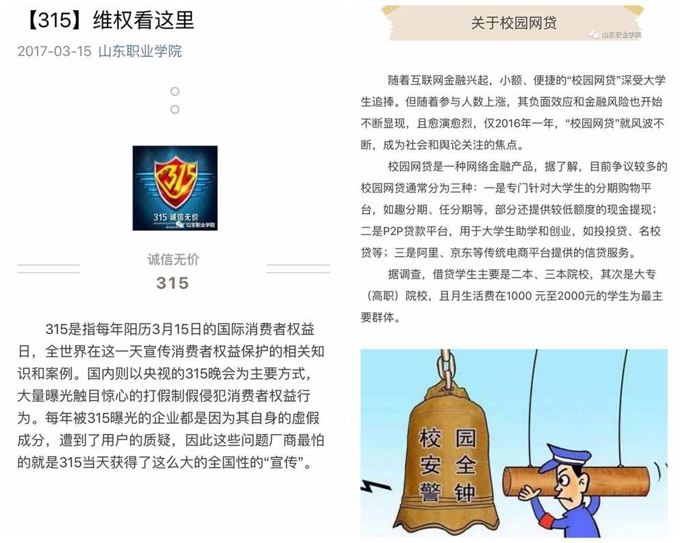 微博微信齊發力。學院通過官方微博、微信等平臺,列舉電信詐騙或掃描二維碼等新型詐騙手段,引導學生學習維權知識,提高維權意識,培養維權觀念,知曉維權過程,做一個明智理性的消費者。針對社會上發生的校園貸陷阱事件,提醒廣大學生要充分認識網絡不良借貸存在的隱患和風險,樹立正確的消費觀,培養艱苦樸素、勤儉節約的優秀品質,遠離不良網貸。
