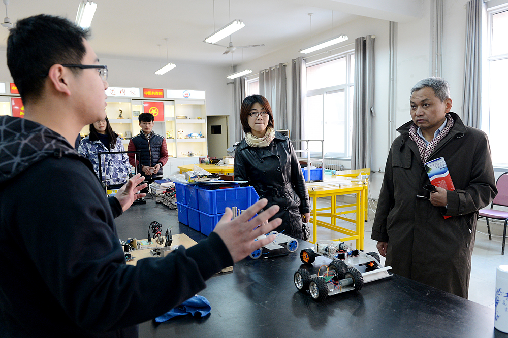 訪問期間,陳寧參贊在學院領導的陪同下參觀了我院軌道機車演練場、城軌車輛實訓中心、電氣化控制實驗室、激光雕刻實訓室、“創新協會”工作站、數控加工中心等實驗實訓場所,并在“創新協會”工作站與部分同學親切交流,觀看了部分創新作品展示,對同學們在科技創新能力、實際操作能力以及職業素養方面給予贊許。