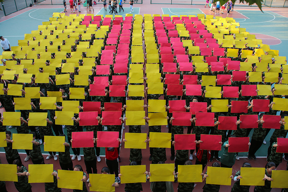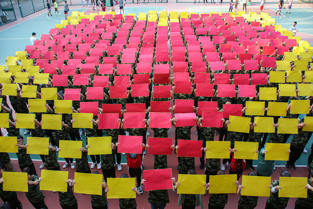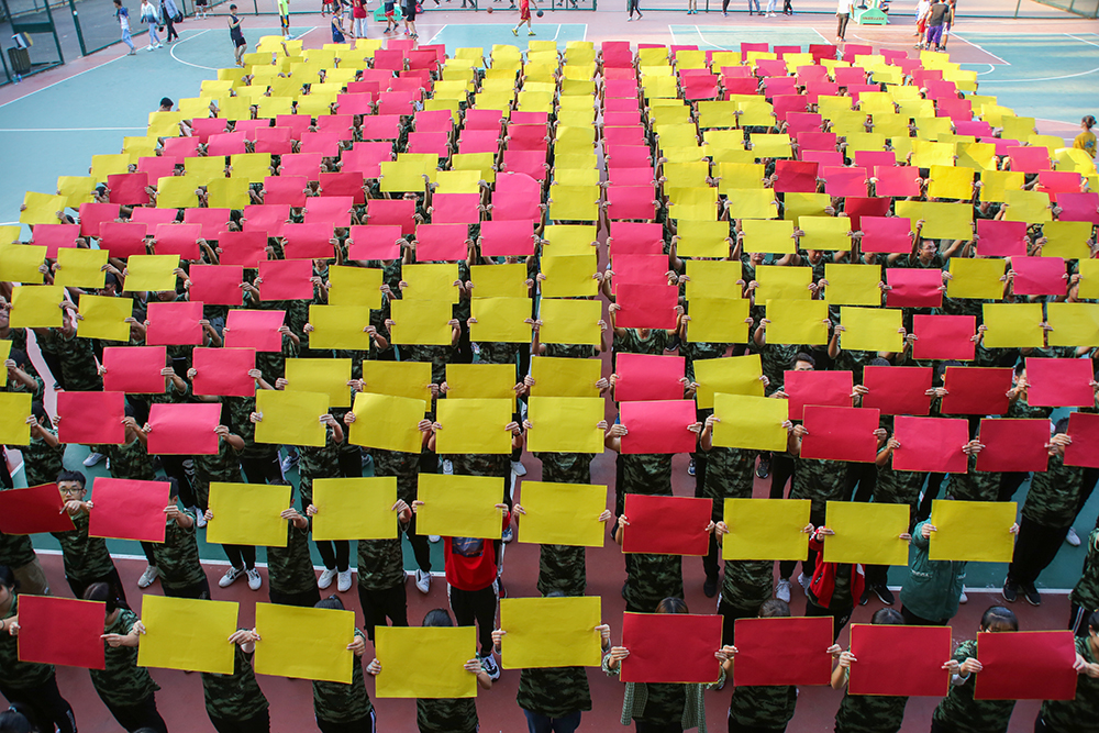 新生們通過手中紅黃兩面方形板的交替翻轉,隨著音樂的節奏和變換不停翻動著,依次擺出“1949”“2019”“70”“我”“愛心”“中國”等圖案,獻禮新中國成立70周年。此次活動共有380名新生參加,通過這種有創意的形式,將新生對國家的愛、對于學校的認同感展示出來,厚植家國情懷,激發使命擔當,幫助新生努力成長為擔當民族復興大任的新時代青年。
