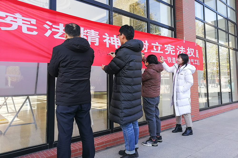 12月4日,在第六個國家憲法日之際,鐵道供電與電氣工程系開展了“橫幅簽名表信心”活動,旨在宣傳憲法知識,弘揚憲法精神,引導師生增強憲法意識、堅定憲法自信。