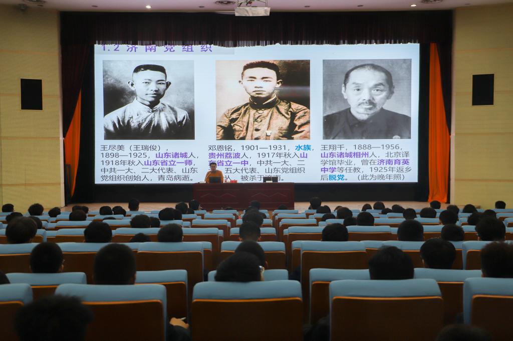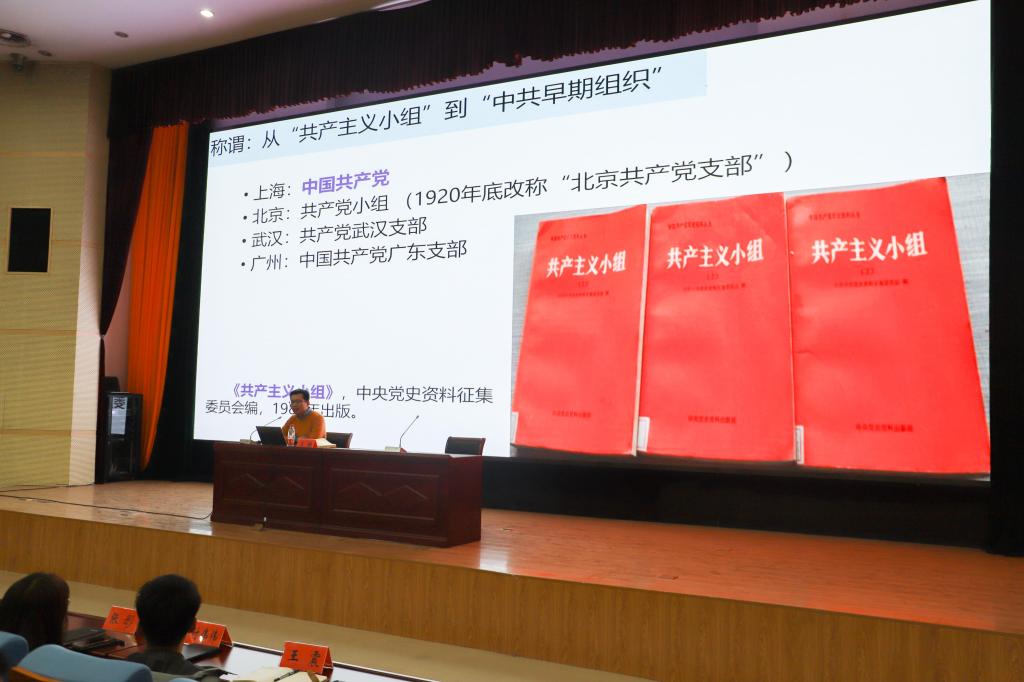隨后,王楠老師圍繞深入學習貫徹習近平總書記在黨史學習教育動員大會上的重要講話精神和關于黨史的重要論述,首先闡明了中央決定在全黨開展黨史學習教育的重大意義,指出要深刻把握習近平總書記在黨史學習教育動員大會上的重要講話精神。他從中共一大召開前的八個共產黨早期組織分布及其成員事跡兩個方面講起,通過講述早期共產黨的建立以及用馬克思主義來“改造中國和世界”的理想展現了中國共產黨為人民、為國家的堅定信念以及艱苦奮斗的偉大精神。他表示,要通過對黨史的學習,鼓舞我們的斗志,樹立遠大理想,在對黨史不斷學習的同時,堅定共產主義信念,不忘初心,牢記使命。