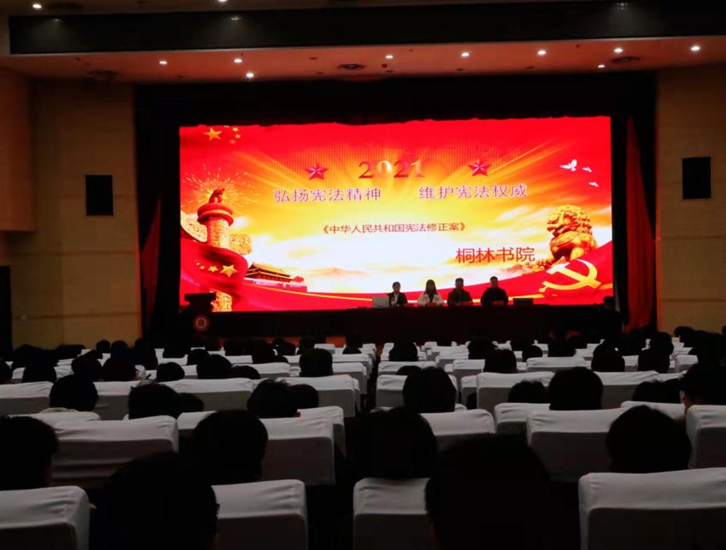 為弘揚憲法精神,進一步增強學生知法、懂法、用法觀念,12月3日晚,桐林書院于圖書行政樓西報告廳組織開展憲法宣傳周活動。桐林書院團總支書記薛高芳以“弘揚憲法精神 維護憲法權威”為題作了報告。書院全體預備黨員參加了活動。