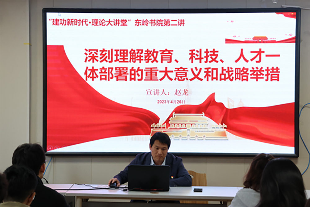 4月26日,東嶺書院“建功新時代·理論大講堂”專題宣講活動第二講在書院右苑一樓黨團活動室開講,邀請人文與基礎課教學部黨總支書記兼主任趙龍進行宣講,東嶺書院部分老師和學生代表參加。
